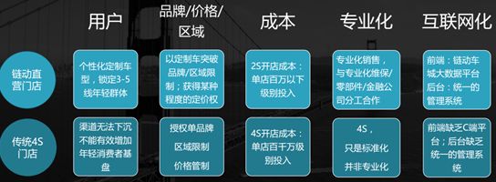 节点效率提升,一是指通过专注于2S的模式,避开传统4S店巨大的建设和运营成本;二是通过规模化连锁经营,集中采购,为消费者提供更具性价比优势的车型;三是指利用互联网、大数据、车联网等工具,在电商平台和管理后台进行数据融合,大幅提升效率的同时,更实现个性化的定制。