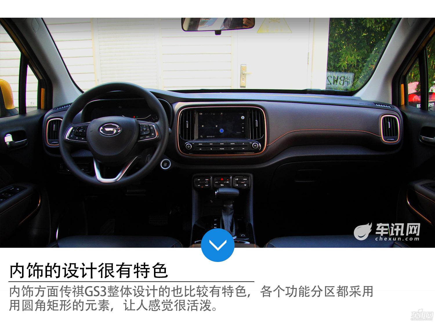 传祺GS3的内饰相当富有特色整体性很强,有着它自己独特的调性。坐进车内之后,内饰给人的感觉很亲切同时也富有活力,这种感觉恰到好处,不会让你觉得很简陋,也不会让你觉得很复杂、浮夸。