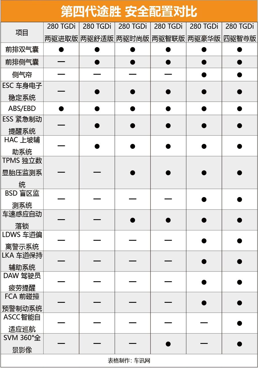 推荐理由:两驱豪华版与时尚/智联版售价一致,主要是安全配置增添LDWS车道偏离警示系统、LKA 车道保持辅助系统、DAW 驾驶员疲劳提醒、FCA 前碰撞预警制动系统等;而两驱智联版车型则有投射式前大灯、blue link、第二代智能网联系统等,且在舒适性配置上更加完备,因此更推荐该车型。