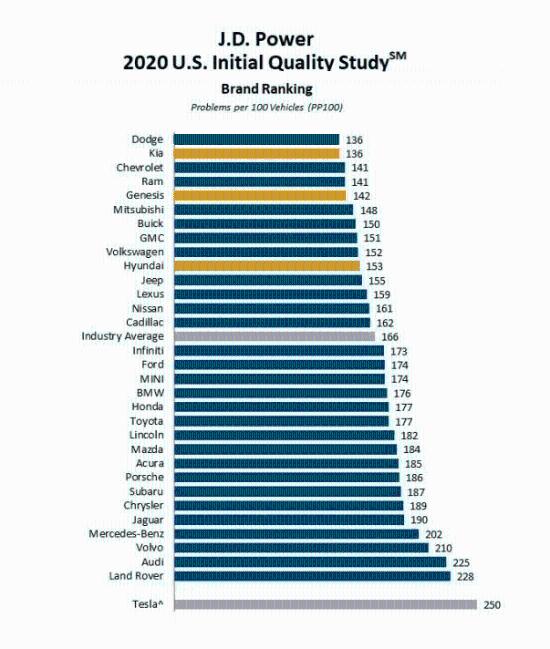 今年是JD Power发布来自特斯拉车主的调查结果数据的第一年,对于这家总部位于加利福尼亚的电动汽车制造商来说,这不是一个好消息。随着250 PP100的分数调整,特斯拉是在2020年倒数一地,仅次于路虎的得分228PP100。