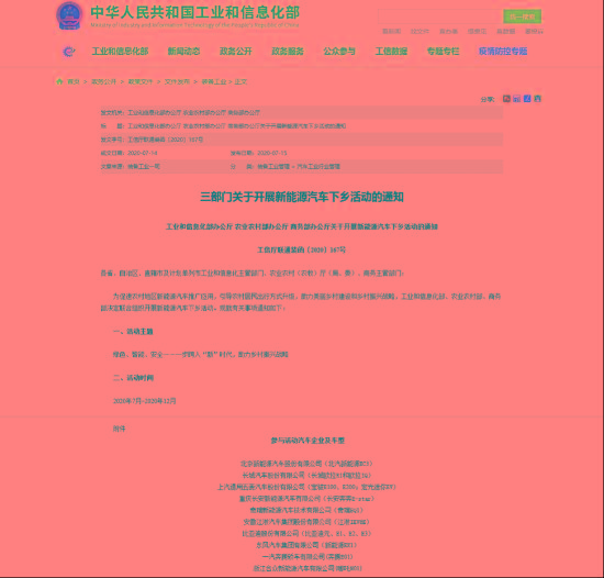7月15日,工信部和信息化部办公厅、农业农村部办公厅、商务部办公厅发布了关于开展新能源汽车下乡活动的通知,正式启动新能源汽车下乡,并公布了参与活动企业和车型,合众旗下哪吒N01也成为此次入选的10款车型之一。