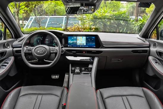 相比起激进的外观造型,第十代索纳塔的内饰设计则是主流的时尚、科技取向。车内氛围以黑色为主体,并辅以金属元素与红色缝线进行点缀。大量软性材质的覆盖以及双12.3英寸显示屏的配备,则保证了不错的精致性与科技感。中央空调出风口的下方还设置有一小块触控面板,保留了部分常用功能;但像是控制温度、风量、座椅加热等,则需要通过中控触摸屏进行操作。此外,新车还采用按键式的电子换挡机构,令整个中控区域更显简洁。