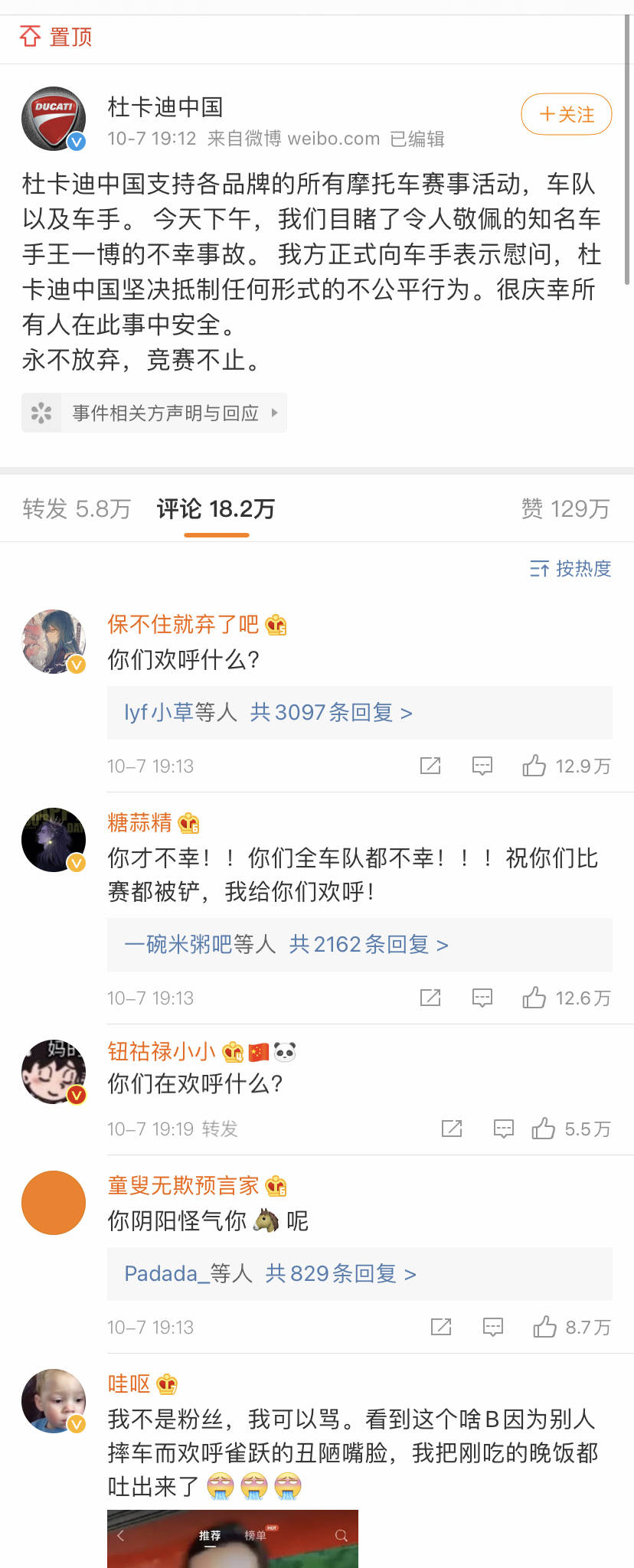 原本这只是一次再正常不过的赛场事故,却因为主角备受关注在网上迅速发酵。事后,胡通明隶属的杜卡迪发表了道歉声明,却遭到粉丝的无情“爆破”。
