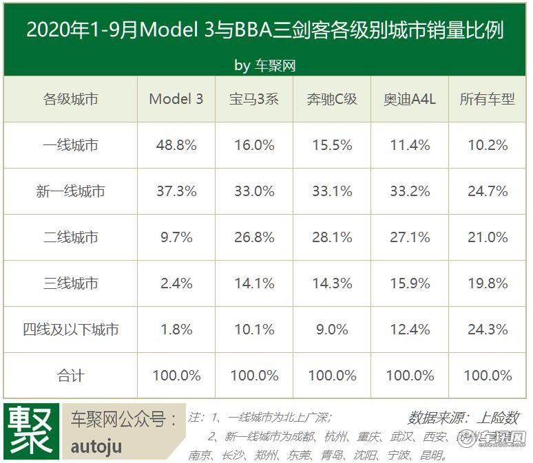 车聚君根据上险数和中国城市分级,得出了Model 3和BBA三剑客的分布比例。