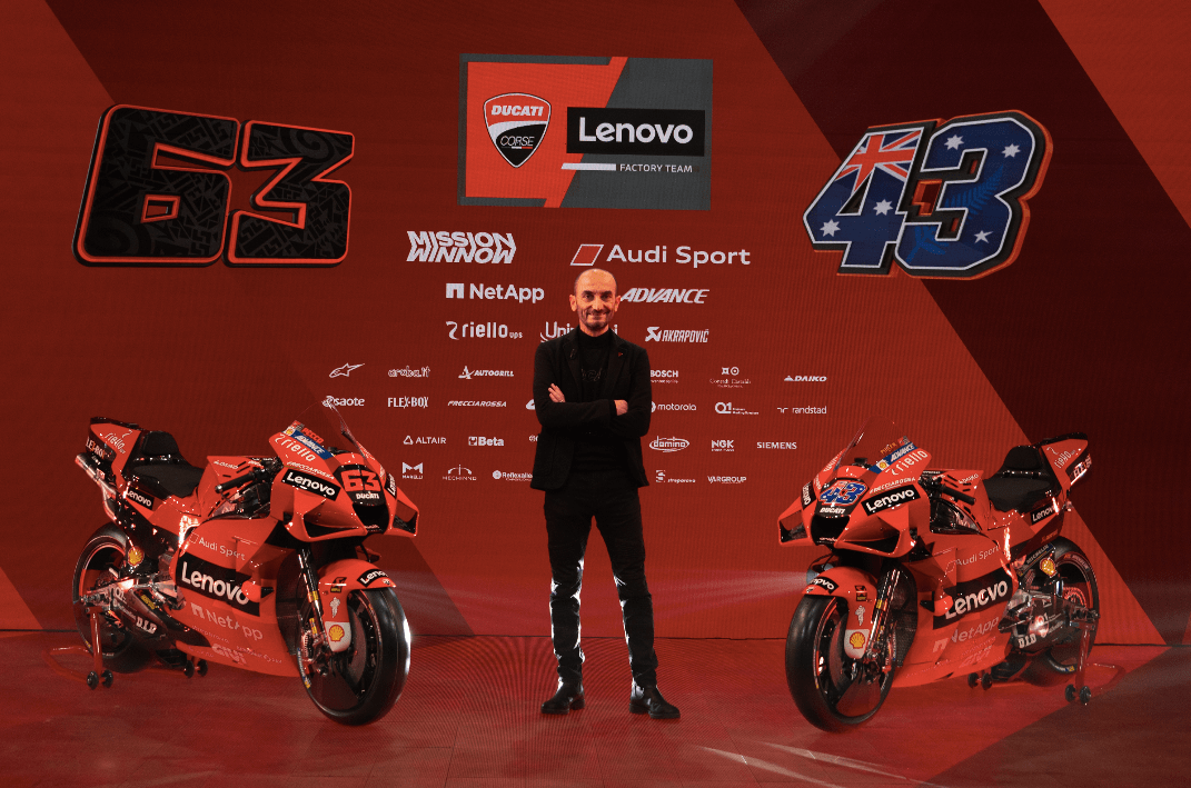 杜卡迪汽车控股公司首席执行官克劳迪奥·多梅尼卡里(Claudio Domenicali)表示:“开始新的赛季总是令人激动的,在世界范围内杜卡迪车迷的支持下,我们将一如既往地以奉献精神和令人难以置信的热情面对。尽管复杂性迫使我们需要克服以前从未遇到过的障碍和情况,但他们仍然在去年赢得了“冠军制造商”称号。2021年,从车手开始,杰克·米勒和佩奇·巴格纳亚有了很多傲人之处。我们的官方车队的年轻车手获得了Pramac赛车队的出色经验。自2018年以来一直陪伴我们的联想终于在今年成为杜卡迪联想车队的新冠名合作伙伴,加上我们工厂车队的车手,我们还拥有杜卡迪的MotoGP车手Johann Zarco和来自Moto2,Enea Bastianini,Luca Marini和Jorge Martin三位天才车手,我们期待着他们成为冠军,他们将是一个非常年轻且面向未来的团队。我们期待3月28日在卡塔尔一如既往地开始2021年赛季。