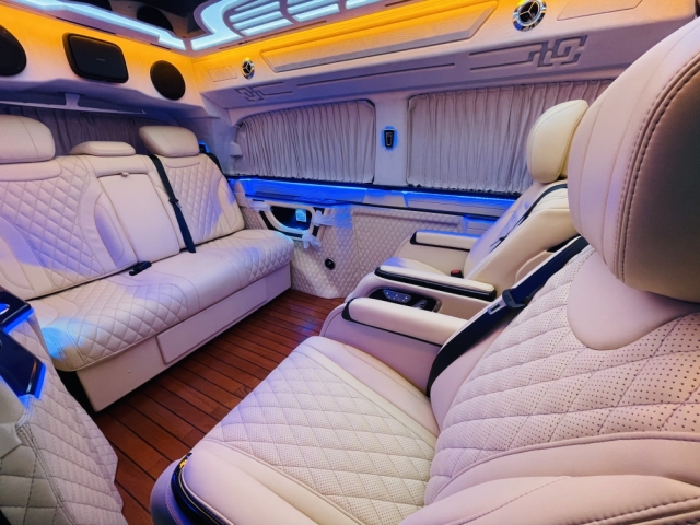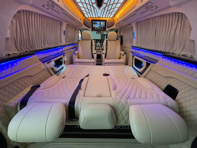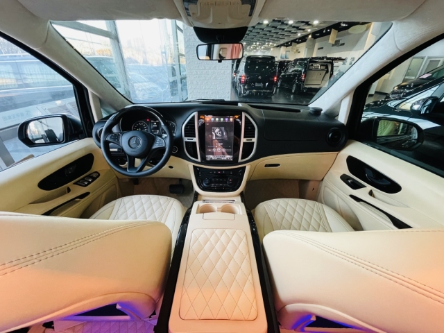 后排座椅采用高端定制的商务座椅,前排座椅后背搭载折叠的小桌板,方便后排乘客处理商务文件或者在车内就餐。专门定制航空头等舱按摩座椅可以全身气筒按摩,舒适感受,更能多项调节,通风加热。疲乏时也可展开腿托,舒适休息。奔驰威霆改装商务车座椅设计得宽大舒适。奔驰威霆改装高顶隔断7座商务车后排排两个独立,并带脚托、座椅记忆,电动升降头枕、座椅通风加热功能,享受堪称“头等舱”级别,设计体贴入微。更多的个人车主或是改装厂家,愿意将奔驰威霆打造成一款更加符合高端定位的豪华商务用车。