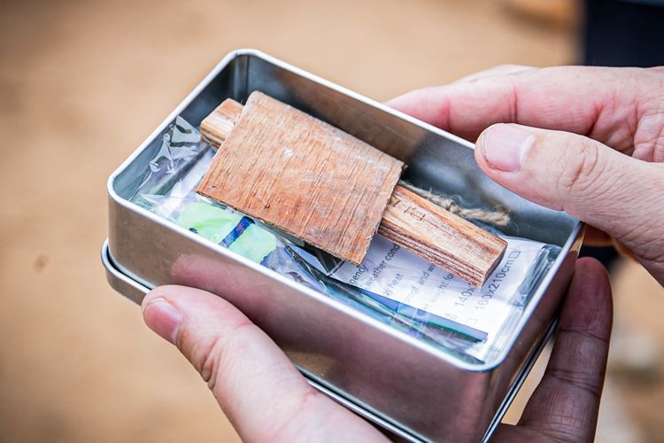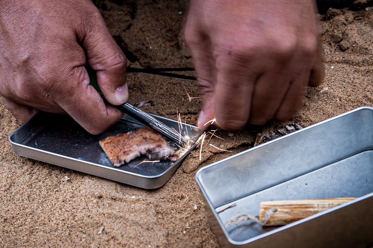 驾训体验营为每位来宾准备一个小盒子,里面除了打火石(镁棒),还有一小片树皮。首先用镁棒附属的铁片,从树皮上刮下一些木削,这是上好的引火材料。