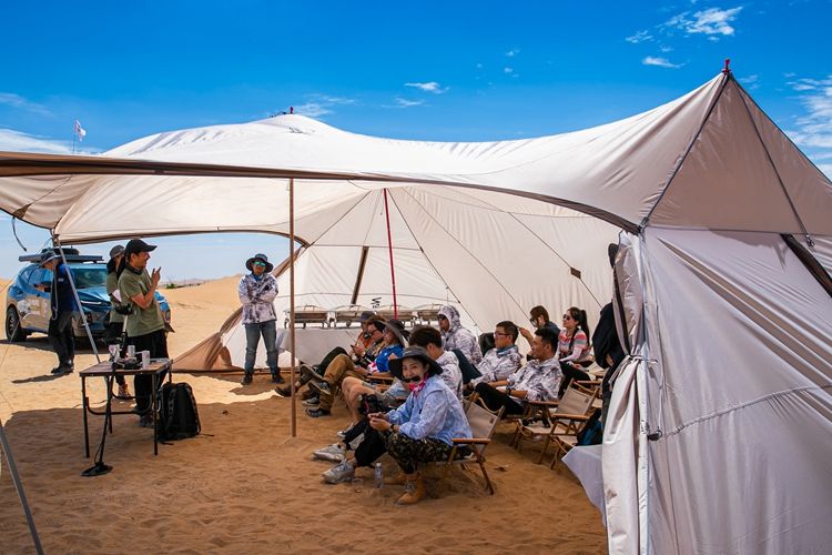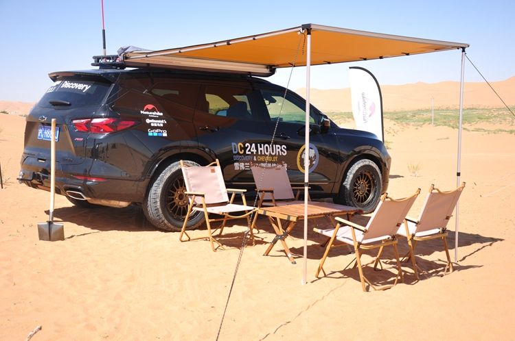 除了基础训练课程,驾训体验营还有一些很轻松的享受类活动——每辆开拓者都装备着车顶架和车边帐,打开它,就能在炙热的沙海中,获得一片清凉。