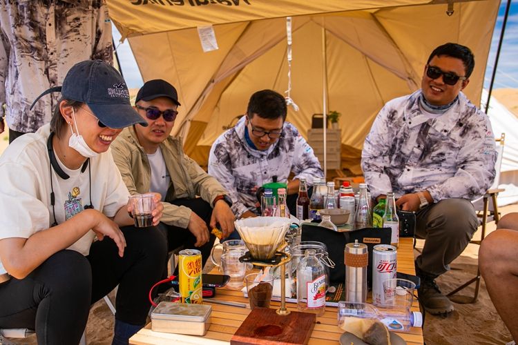 雪佛兰的营地,比我的装备更加周全,不仅有大量 帐篷与桌椅,还有琳琅满目的吃喝——在浩瀚的沙海里,我们坐在遮阳棚下,居然可以弄出手冲咖啡。怎么样,够奢侈吧?