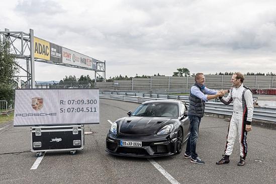 此外,718 Cayman GT4 RS 更在 7 分 4 秒 511 内跨越了较短的 20.6 公里单圈赛程,成绩比它的小老弟 718 Cayman GT4 快 23.6 秒。这款中置引擎跑车配备了赛车座椅以确保驾驶安全,轮胎则搭配了米其林 Pilot Sport Cup 2 R。此次测试亦有公证人在场确认车辆状况及车身重量。