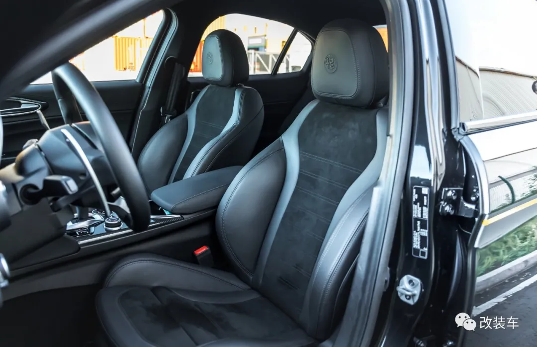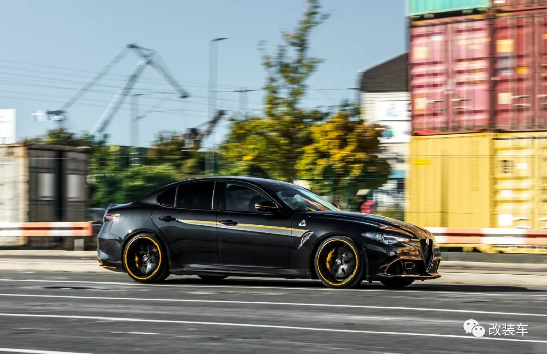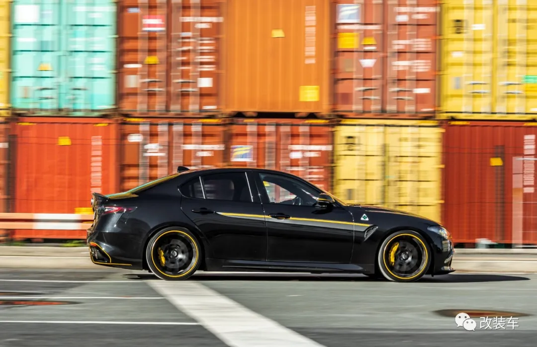 外观部分非常传统,MANHART固有的黑底+黄色描边,再次出现在Giulia身上,跟原厂竞速红是完全不一样的风格。在H&R短簧的加持下,车身也降低了4公分,低调的同时保持足够的侵略性。