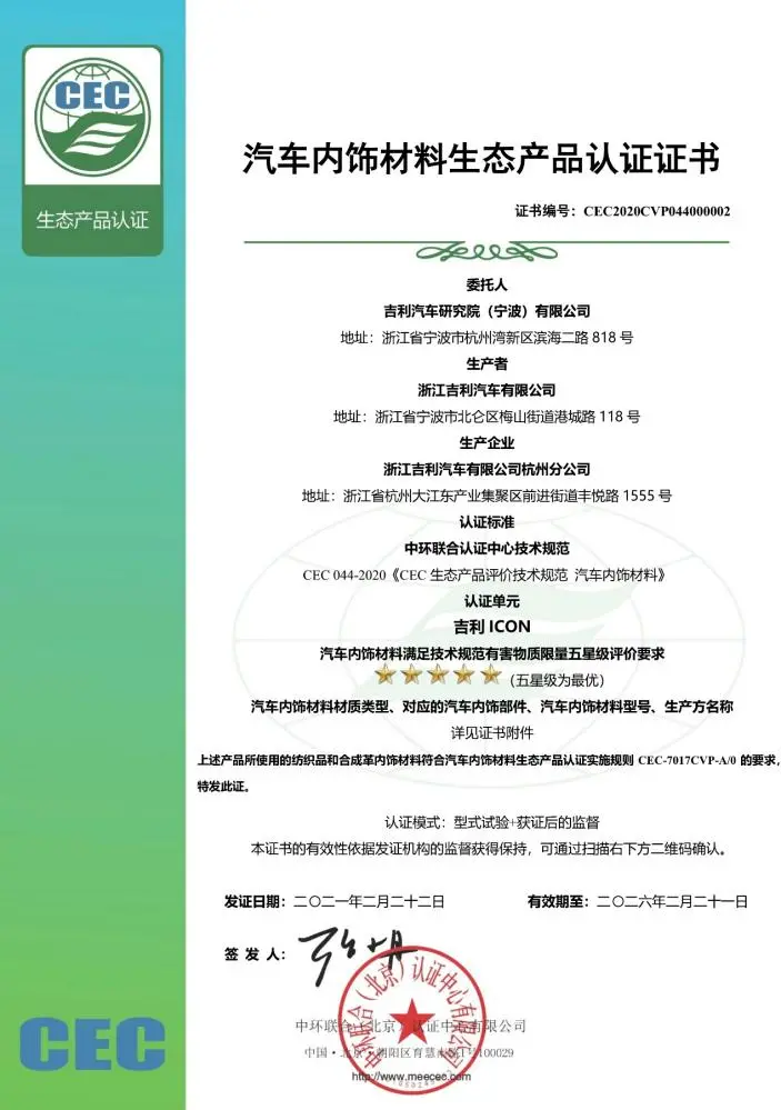 在内饰材质上,吉利ICON是自主品牌首款获得五星级CEC生态产品认证的车型,内饰环保级别达到婴儿级标准。另外,吉利ICON全系标配中汽研官方CN95认证的 “真车规级CN95高效符合空调滤芯”,升级为具备车内病毒隔离防范功能的IAPS智能空气净化系统,让车内空气更清新,让用户出行更安心。