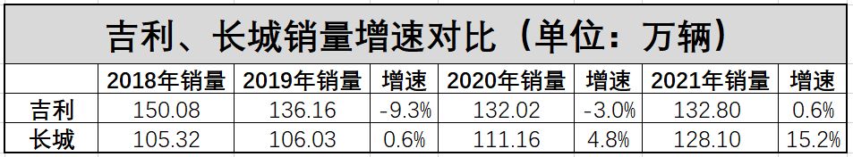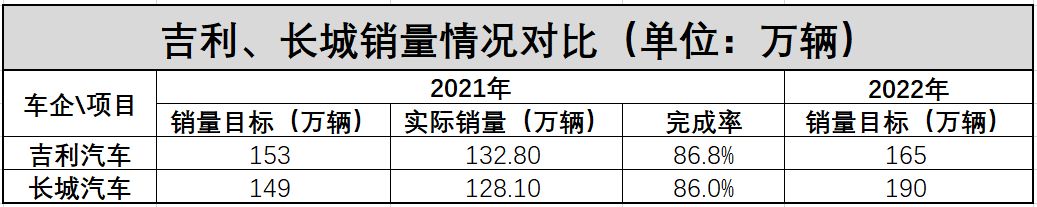 可惜的是,两强选手均未能完成年初定下的销量目标。吉利汽车将2021年销量目标定为153万辆(含领克品牌),实际销量为132.80万辆,目标完成率为86.8%;长城汽车在2021年5月将全年销量目标由121万辆提升至149万辆,实际完成128.10万辆,达成目标销量的86.0%。