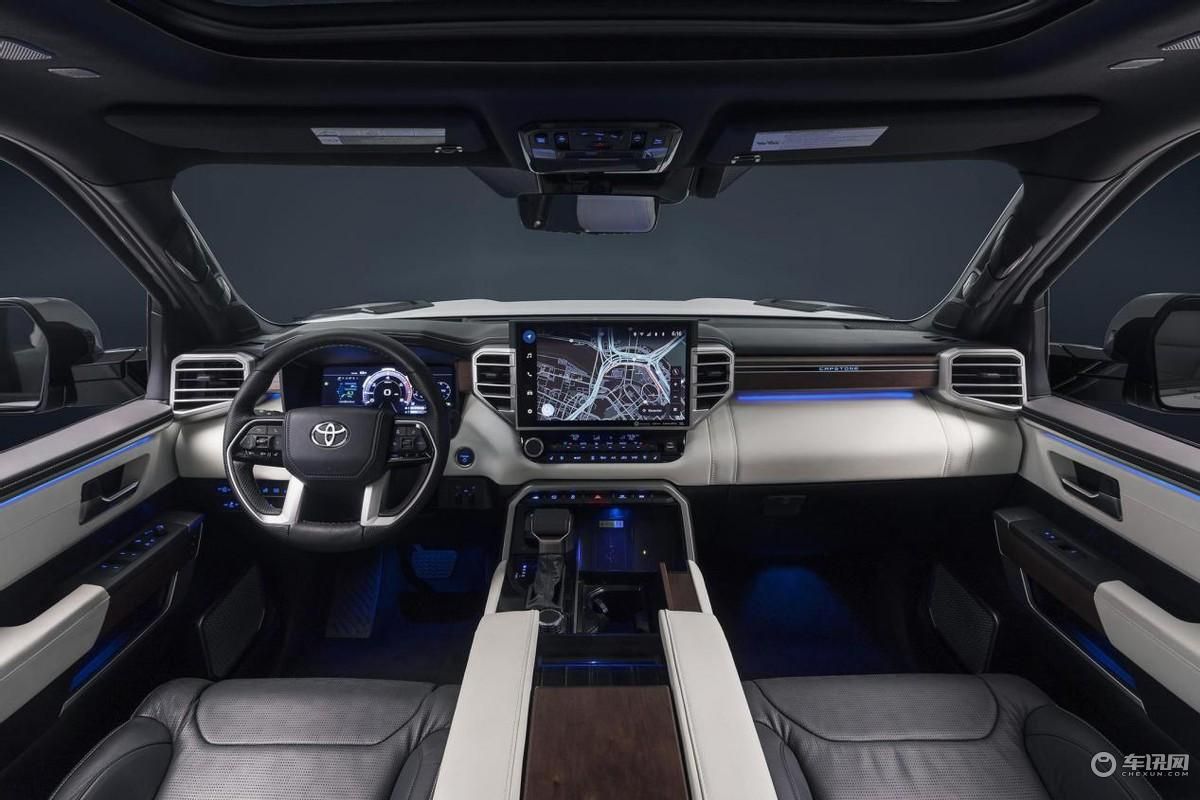 在内饰上,丰田坦途Capstone的内饰沿用了丰田家族式的设计语言,大量的软性材质的包覆,让丰田坦途Capstone内饰氛围营造得非常具有豪华感。在配置上,丰田坦途Capstone配备了多功能方向盘、14寸液晶中控屏、12.3全液晶仪表、蓝色氛围灯、12扬声器JBL音响、车道偏离预警、碰撞预警、自适应巡航、自适应远光灯、道路标识识别等多项科技配置。