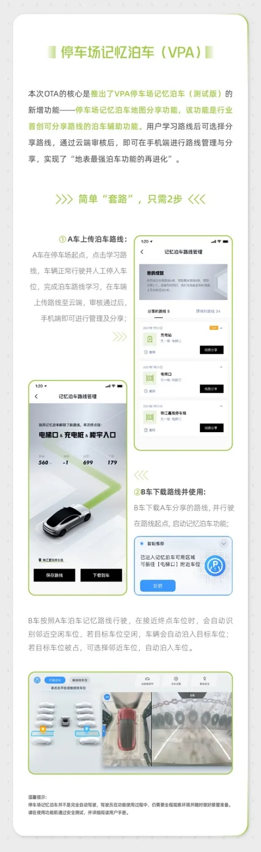 本次OTA后,VPA停车场记忆泊车将支持用户对泊车路线进行管理及分享,不仅方便自己,更可以共享他人,在使用场景上进一步拓展,比如应用于大型商超或地下停车场的超充站点,用户可在获取其他人分享路线的基础上,在这些高频场景快速、高效的抵达电梯口附近或超充站点停车位置。