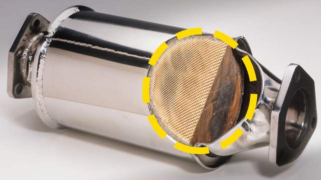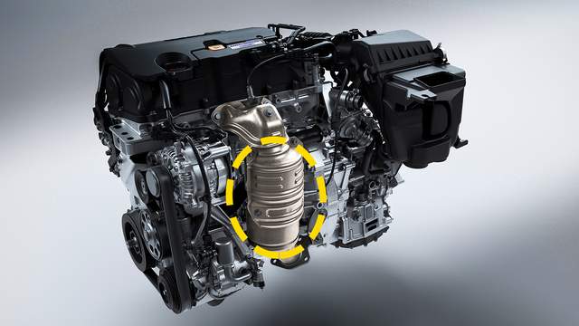 众所周知,汽车为了降低污染物的排放量,都会在排气位置增加三元催化器这个部件(上图黄框)。主要目的就是将尾气中的一氧化碳、碳氢化合物、氮氧化物这三种污染物,通过催化剂和高温反应,变成无污染的二氧化碳、氮气和水。