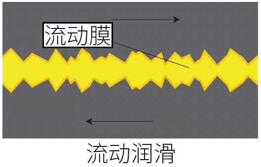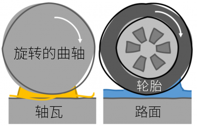 而机油润滑中的第二个大类--流动润滑,则是指在两个金属之间建立一个流动的油膜(上图左侧黄色部分)。此时,由于金属与金属之间(上图左侧灰色部分)被流动的油膜完全隔离,所以几乎不存在磨损情况。这种流动润滑就跟汽车在高速行驶时忽然碾过一片积水地,轮胎与路面之间形成的那道水膜一样,会隔绝轮胎与地面的接触,因此轮胎也不会产生磨损。