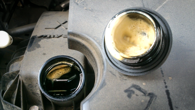 这是因为汽油与空气在发动机内燃烧后,会产生高温水蒸汽,这些高温水蒸气虽然大部分都会通过排气管排走,形成我们在车外看到排气管冒出的“白烟”,但还会有一部分通过活塞与缸壁之间的缝隙窜入曲轴箱。而在冷车状态下,由于曲轴箱内的温度很低,所以这部分高温水蒸气便会遇冷迅速凝结,并变成液态水滴混入曲轴箱内的机油中。