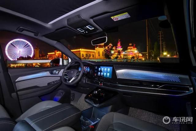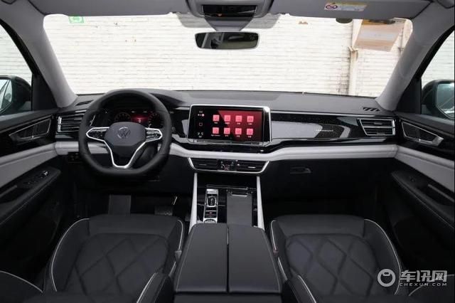 来到车内,同样是MQB EVO的产物,大众最新的设计语言,触控按键和液晶屏带来了不错的科技感,方形出风口和直来直去的中控台再一次贯彻了途昂方正稳妥的气质,而副驾前方和门板的亮黑以及星空背景灯的设计却显得十分有心。