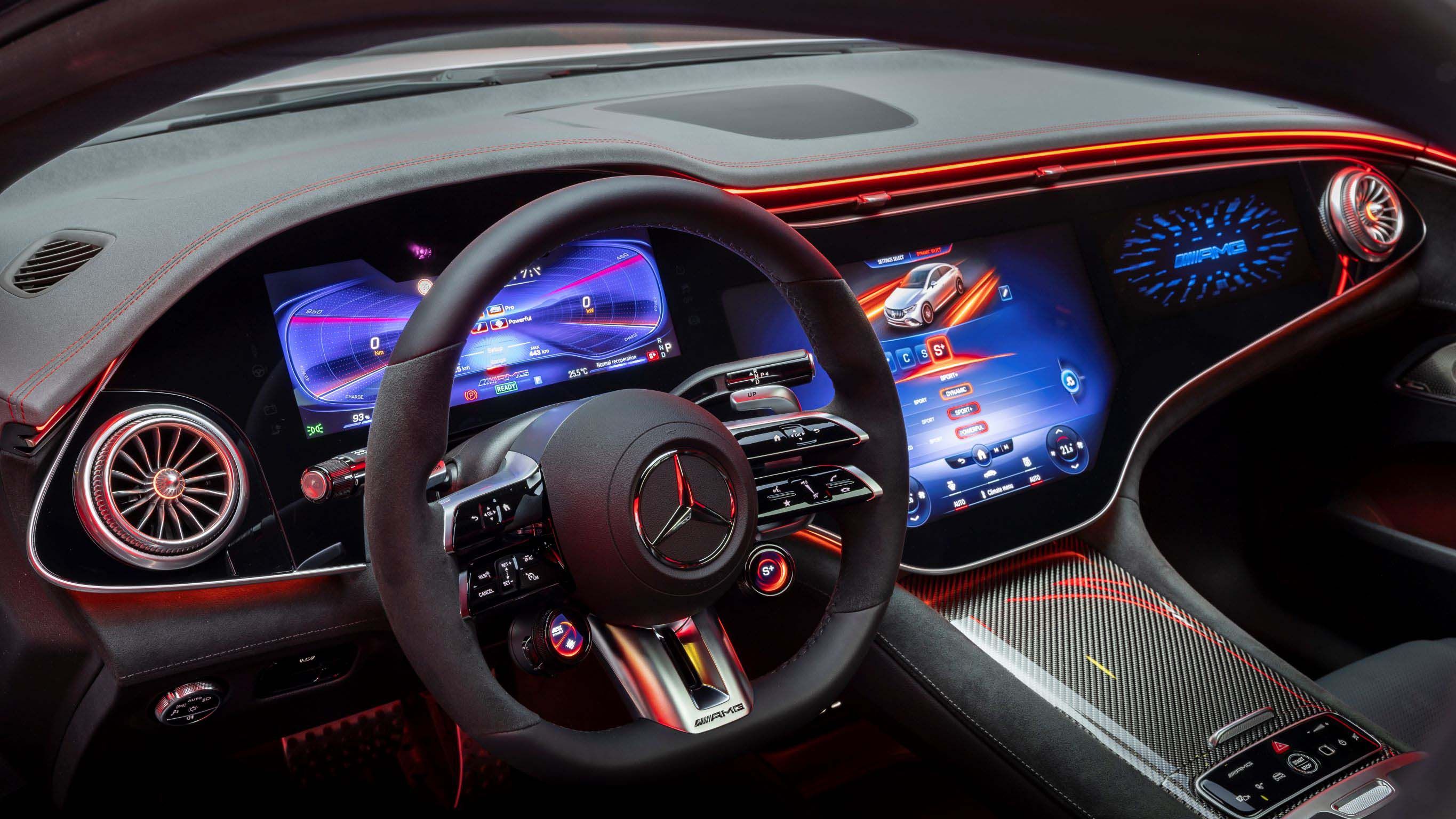 内饰设计更是将性能豪华的氛围推向极致,譬如Nappa皮革包裹的AMG座椅与AMG高性能方向盘、触手可及的AMG操控单元和随处可见的AMG标识。整合了三块屏幕、宽度达1.41米的MBUX超联屏不仅拥有“零层级界面”等创新科技,更为驾驶者提供AMG专属用户界面和AMG TRACK PACE虚拟竞赛工程师,可尽享驾驶乐趣。