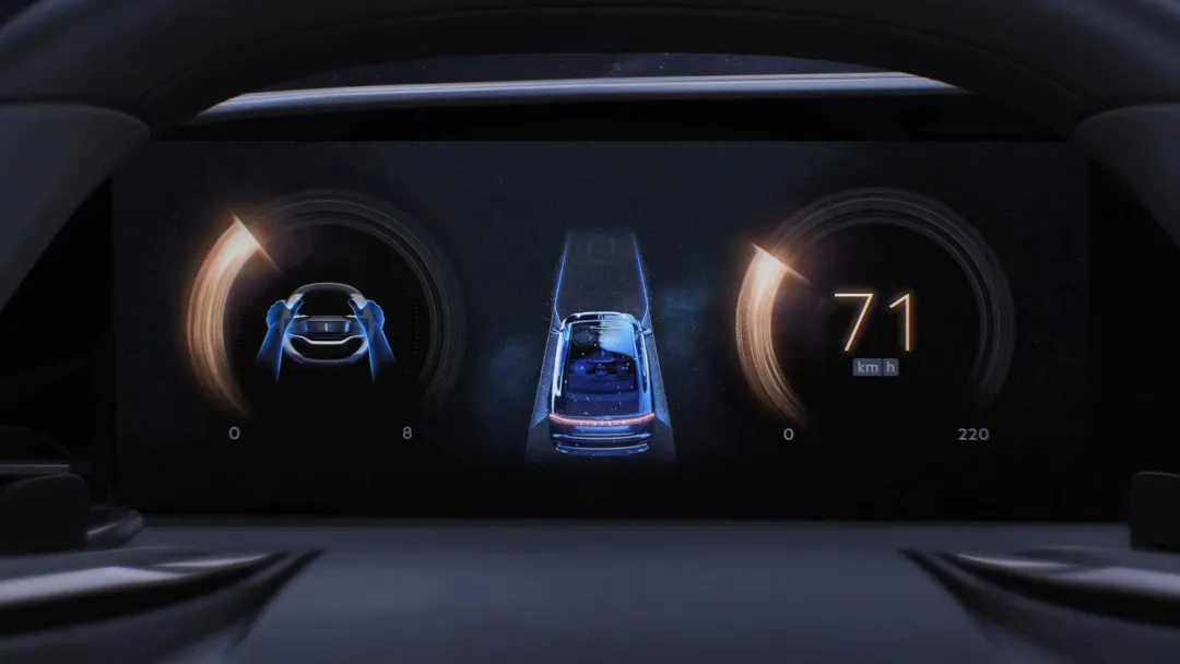 内饰方面,12.3英寸液晶仪表盘+27英寸中控大屏,拥有1.1米惊人长度的贯穿式大屏,充满了无尽幻想。