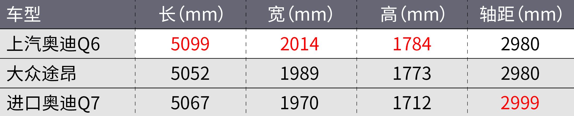 Q6的车身侧面造型比较魁梧,尤其是C柱往后的区域长度十分夸张,这应该是为了提升第三排乘坐空间以及后备箱储物空间所设计的。尺寸方面,上汽奥迪Q6的车长达到了5.1米,车宽也超过了2米,轴距则是与途昂相同的2980mm。相比采用纵置平台的Q7来说,Q6也仅仅是在轴距上略有落后。考虑到Q6与大众途昂是同平台车型,并且拥有相同的轴距,所以我们推测Q6的内部乘坐空间也会极其宽敞,甚至会成为迄今为止空间最大的奥迪SUV。