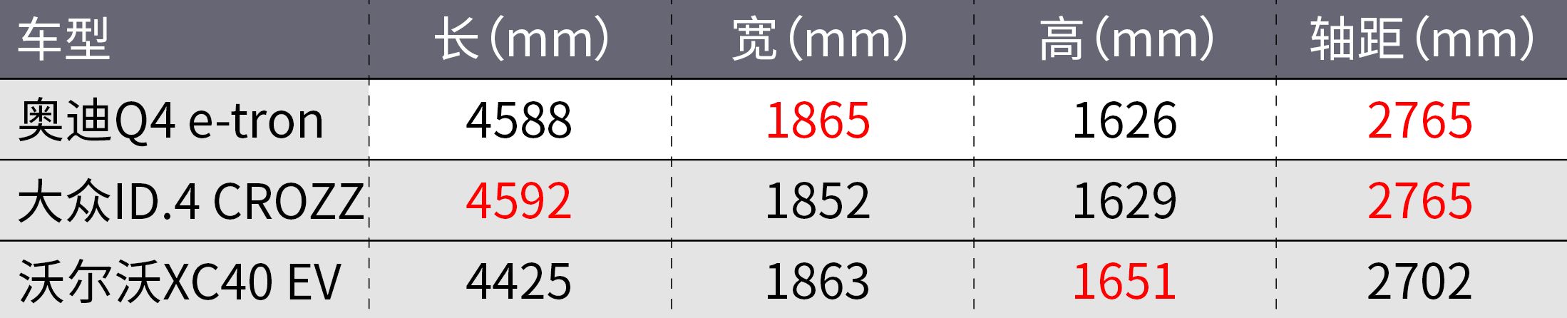 尺寸方面,Q4 e-tron与同平台的大众ID.4 CROZZ基本相仿,相比类似定位的XC40纯电版要更大一些,算是紧凑型SUV的主流水平。