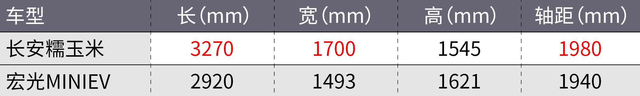 尺寸方面,糯玉米相比五菱宏光MINIEV在长、宽、轴距上都有明显优势,高度反而更低一些。相比MINIEV偏向“瘦高”的身材,糯玉米更像是一辆正常的两厢小车,车身宽度明显大于高度,再加上更长的车身和轴距,理论上车辆的行驶稳定性会有明显优势。同时,更大的尺寸对于车内空间也有一定帮助,相信糯玉米车内应该不会出现MINIEV那种主副驾紧贴在一起的情况。
