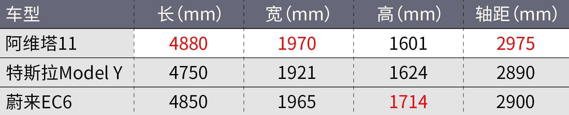 从车辆侧面可以明显看出轿跑SUV的风格,车顶从C柱开始以一个夸张的溜背一直延伸至车尾,侧面看起来甚至有点阿斯顿·马丁DBX的味道。尺寸方面,阿维塔11相比类似定位的特斯拉Model Y以及蔚来EC6都要更大一圈,唯独车身高度只有1601mm,也很符合其看起来修长低矮的观感。在轮胎规格上,阿维塔11提供了265/45R21、265/40R22这两种尺寸,与其车身搭配显得十分霸气。