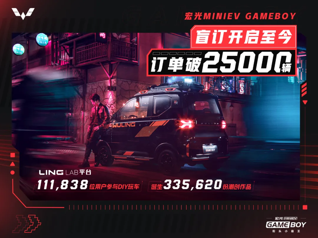 4月1日,上汽通用五菱宣布,“街头小霸王”宏光MINIEV GAMEBOY将于4月8日潮酷上市,带领用户畅玩潮创游戏新世界。自盲订开启以来,新车掀起抢订狂潮,23天的时间,订单已突破25000辆。同期上线的“国内首个原厂个性化定制服务平台”LING LAB也累计收获111,838位用户的青睐,平台上共诞生335,620份优秀潮创作品。