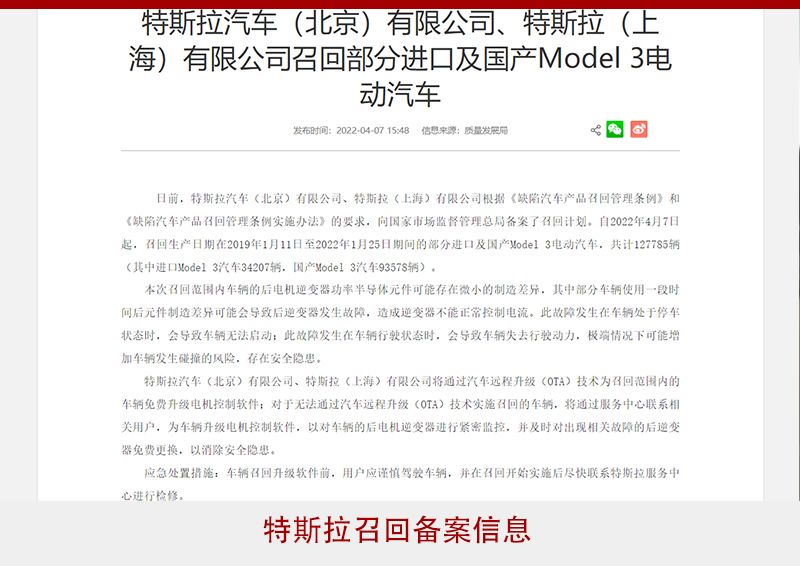 【车讯网 报道】4月7日,据国家市场监督管理总局官网消息,特斯拉汽车(北京)有限公司、特斯拉(上海)有限公司向国家市场监督管理总局备案了召回计划,决定自2022年4月7日起,召回生产日期在2019年1月11日至2022年1月25日期间的部分进口及国产Model 3,共计127785辆,其中进口Model 3汽车34207辆,国产Model 3汽车93578辆。