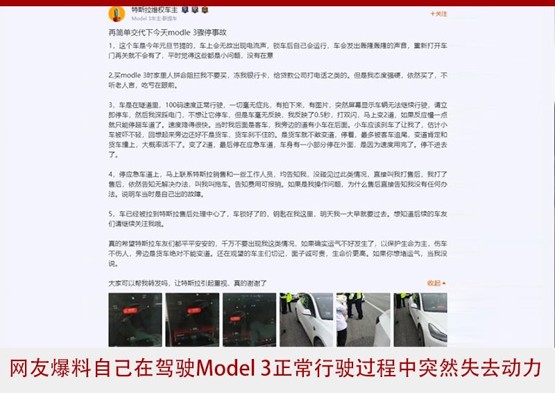 就在特斯拉备案召回计划当日,有网友爆料称,自己驾驶特斯拉Model 3行驶在高速公路上,在经过隧道时,屏幕突然显示车辆无法继续行驶,继而失去动力。