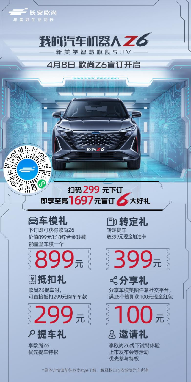 刚好4月8日晚,长安欧尚Z6开启盲订,299元下订即享至高1697元盲订6大好礼,也是能撸上一把的。按照欧尚X系列热销的经验参考,Z系列大有火爆势头,800万长安欧尚车主能否再迎更多新成员,它责任重大。