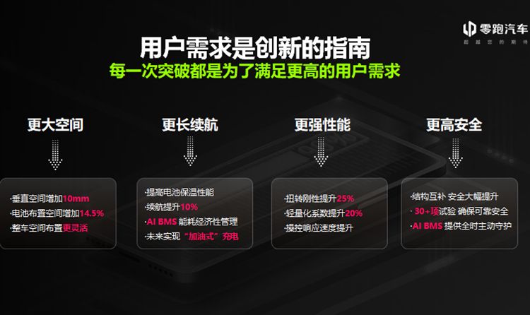 续航方面,由于具备更好的气密性,可以提升电池保温性能,同时,基于创新性软件应用AIBMS大数据电池管理系统带来的能耗经济性管理,综合提升整车续航里程10%。随着零跑智能动力CTC技术的不断进化,在未来,甚至可以实现“加油式”充电——充电5分钟,续航超过200公里。