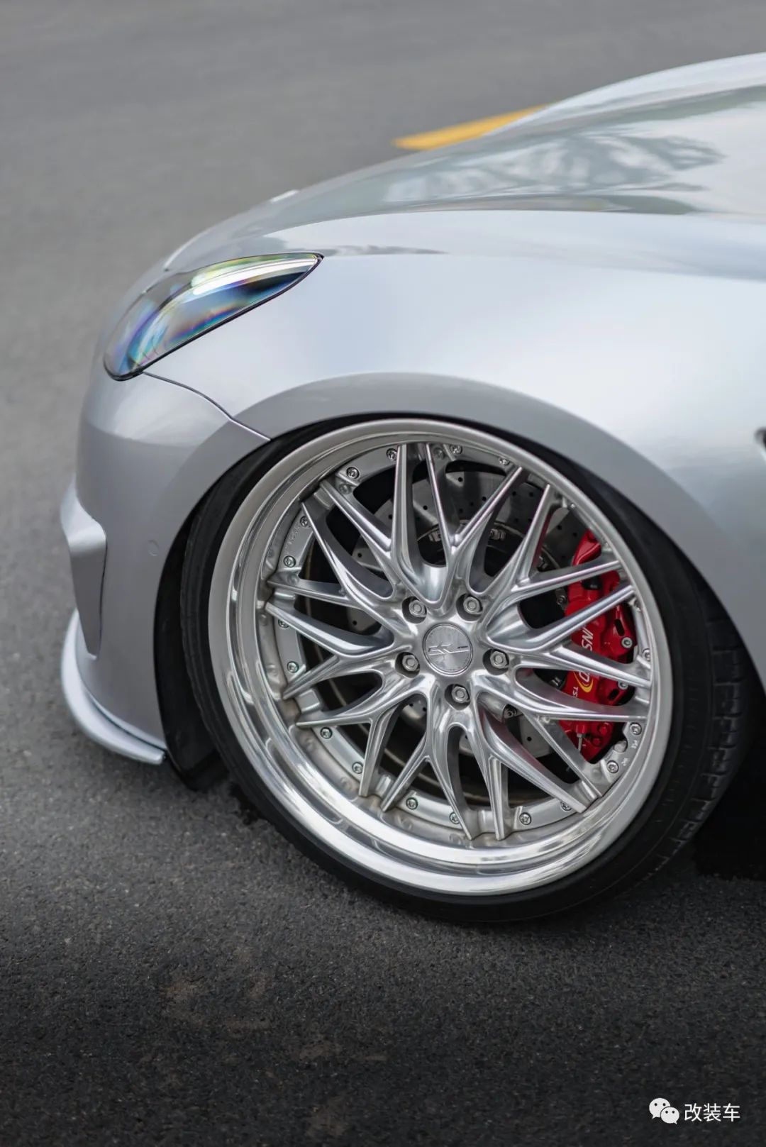 轮毂方面,从之前的19寸的Rotiform BUC轮毂搭配前轮Aerodisc空气罩,换成了现在的WORK SCHWERT QUELL 20寸轮毂,搭配上前后可调底盘件,做出了更完美的姿态。