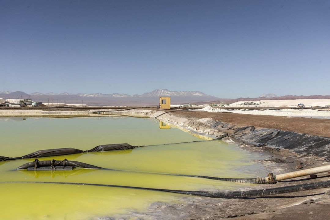 在智利的阿尔伯玛尔矿区,管道将盐水从水池中抽出▼