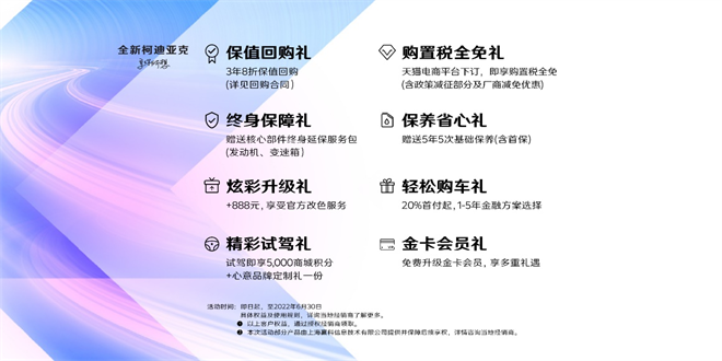 以不久前启售的全新柯迪亚克为例,消费者下订即享购置税全免礼,还有3年8折保值回购、核心部件(发动机、变速箱)终身质保、官方改色服务、5年5次基础保养(含首保)、20%首付起1-5年金融方案等多重礼遇。详情请咨询上汽大众斯柯达当地经销商。