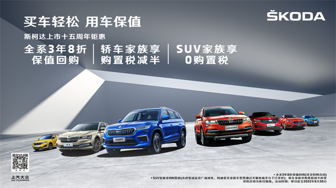 为积极响应国家购置税减半政策,上汽大众斯柯达带来6月加码购车优惠,消费者即日起购买旗下SUV产品购置税全免,还有覆盖旗下全系车型的3年8折保值回购,以及20%首付起的轻松购车金融礼遇,让消费者加码享受“减税降费”带来的实惠。