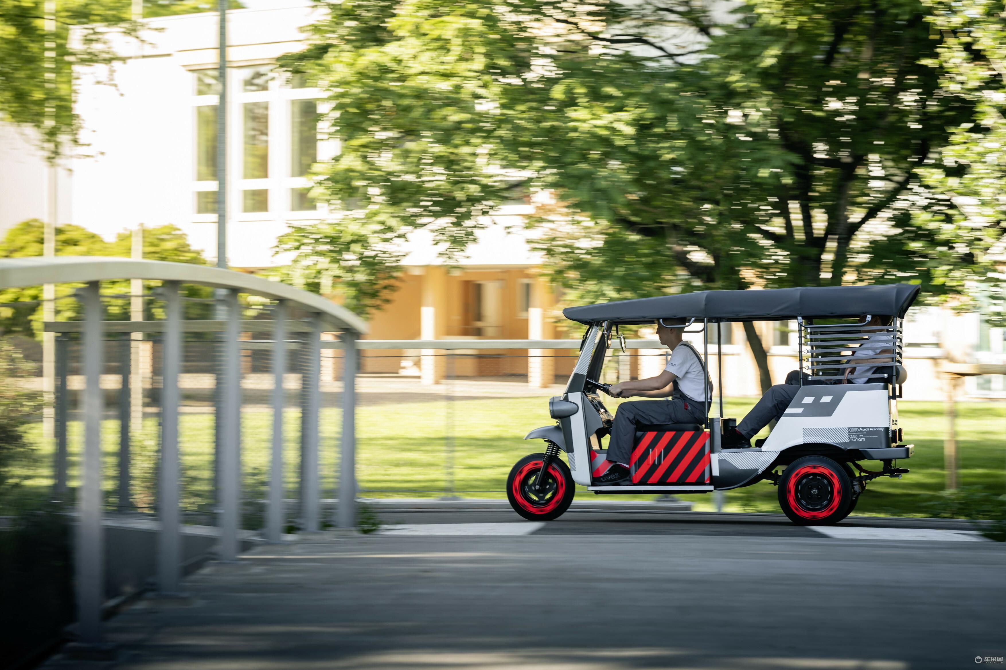 于是奥迪的内卡苏尔姆工厂就找到了德印非营利性初创公司Nunam来合作,开发了一款名为e-rickshaws电动三镚子,除了车头前脸与车尾中间彰显其身份的四环logo外,该车最大的亮点便是搭载了从奥迪e-tronSUV测试车上退役的动力电池。