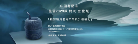 除上述礼遇以外,8月31日前订购星瑞2023款“只此青绿版”的用户,还可额外享受价值2000元【只此青绿】文创周边礼包;时空版还推出专属星辰礼包,选装价格为20000元。同时,为感谢星瑞20万用户的信赖与支持,吉利还推出“银河精灵”车机升级福利,可实现免拆车机、无损安装,即可享银河OS智能体验,市场指导价1988元;10月31日前,用户还可以在吉利汽车APP、吉利精品小程序、京东吉利汽车官方旗舰店领取1388元厂家补贴券,只需600元即可获得。