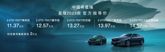 2022年7月18日,“中国有星瑞—《只此青绿》&星瑞2023款跨时空对话上市发布会”在成都举行。发布会上,星瑞2023款正式上市,推出精英型、豪华型、时空版、尊贵型和只此青绿版共5款车型,官方指导价为11.37万元-14.57万元。