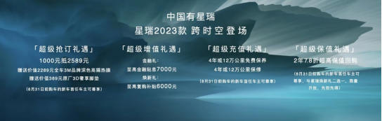 同时,8月31日前下定星瑞2023款即可享受四大超级礼遇:1、“超级抢订礼遇”,1000元抵2589元,并赠送价值2289元全车3M品牌深色高隔热膜、赠送价值389元原厂3D奢享脚垫;2、“超级增值礼遇”,包括“金融礼”至高金融贴息7000元、“焕新礼”至高复购补贴6000元;3、“超级充值礼遇”,4年或12万公里免费保养以及4年或12万公里保修;4、“超级保值礼遇”,2年7.8折超高保值回购(与“焕新礼”二选一,限量开放,先到先得)。