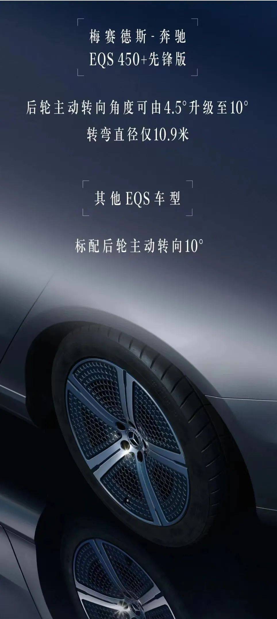 这款入门版的EQS标配4.5度的后轮转向系统,而其他版本的EQS则配备了10度的后轮转向系统,但其实在奔驰的新款S级以及EQS等车型上,4.5度的后轮转向和10度的后轮转向其实用的是同一套机械硬件。