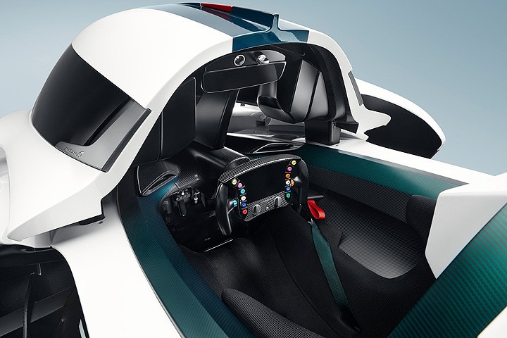此外,向前滑动开启的座舱罩打开后,迈凯伦除了替 Solus GT 搭载了盘辐中央即为彩色显示屏的四辐式多功能赛车方向盘,还植入了防滚笼,以及目前已成为大部分开放式方程式赛车标准安全配备的 Halo 防护装置。