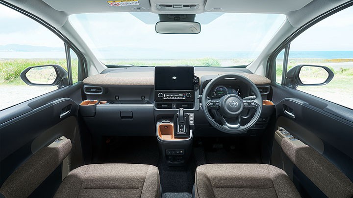 车舱内同样有着圆角方形元素导入,包含在车侧置物空间、杯架与中控处,并且在机能优先的内饰配置下,在各个置物处也加入了象形符号增添趣味。控台表面以及车门把手的装饰处,采用相同的织布材质,再加上和谐的配色,创造出车内一致的视觉感。同时,驻车煞车也都改为电子式、Hybrid 车型更采用变速箱控制更采用线传,因此排档杆造型有所不同。第 3 代 Sienta 也支援最大 7 吋数位仪表显示屏,强化车舱科技感。