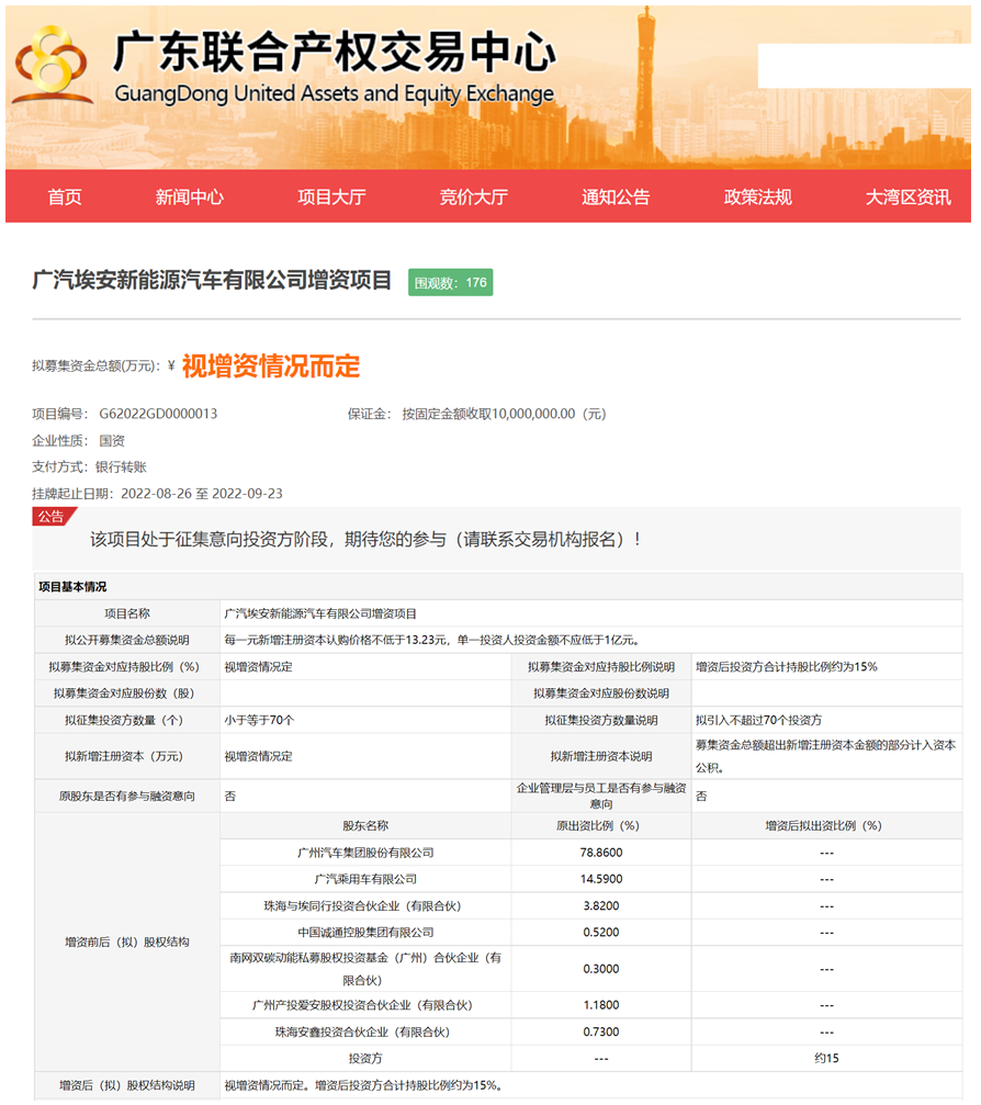 8月26日,埃安A轮引战增资项目在广州产权交易所正式挂牌,符合条件的投资者可在8月26日至9月23日之间报名参与增资,进场摘牌。