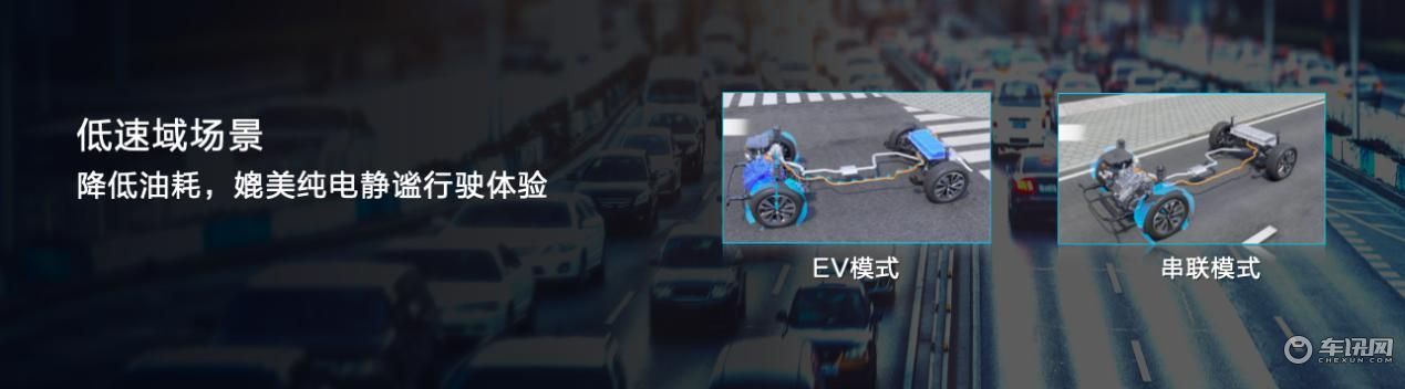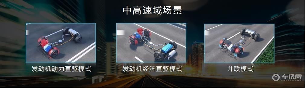 在高速超车及爬坡场景,通过动力挡直驱降低发动机负荷,使发动机工作在最优经济区,换挡、换模过程中,通过发电机辅助调速和驱动电机扭矩补偿,保证切换过程无动力中断、无冲击,真正满足用户全场景的用车需求。