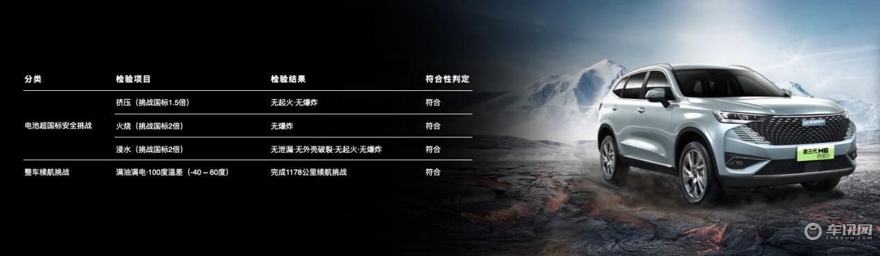 针对当前影响消费者购买新能源产品的里程焦虑和安全焦虑等核心用户“痛点”,哈弗H6超级混动DHT进行了针对性的补强,满足不同用户群体的消费需求。为此,哈弗将哈弗H6超级混动DHT送至中国权威的测试机构——中汽研,做了四项极限挑战。