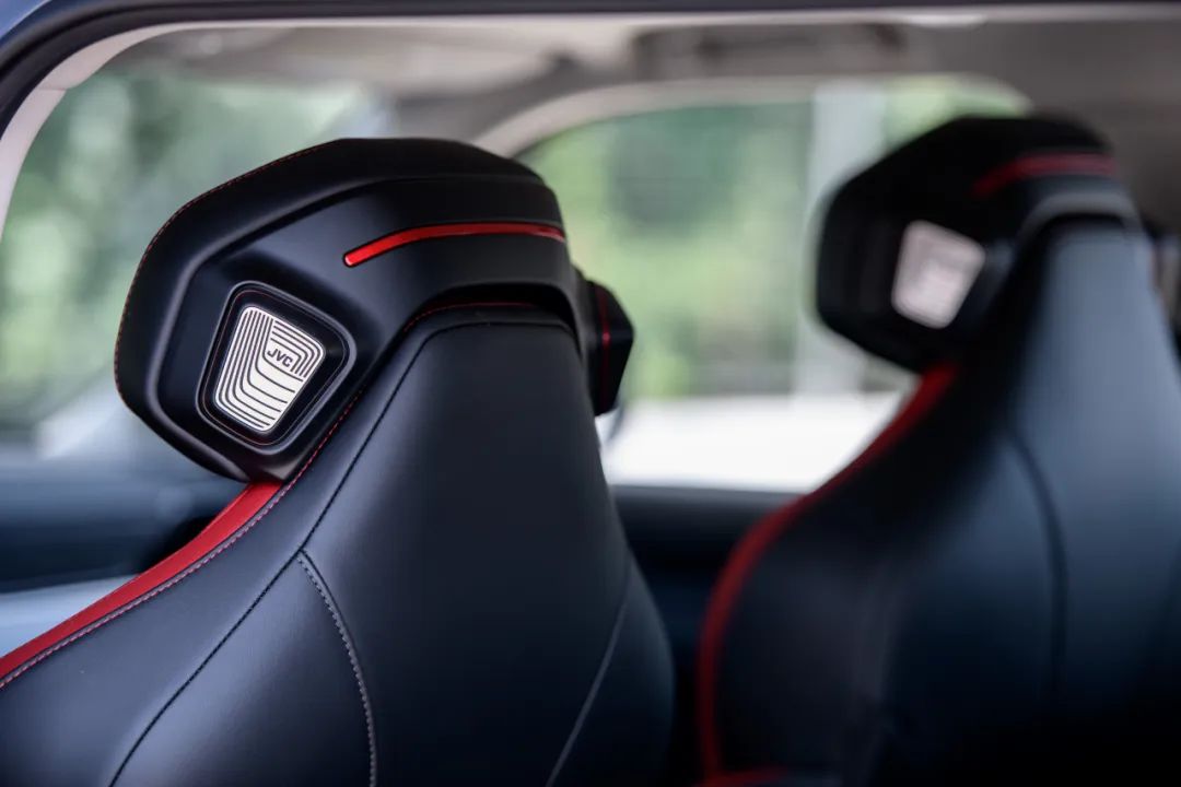 不同于我试驾过的其他车型,一上车被各种大屏幕、氛围灯、碳纤维吸引,坐在酷狗里最吸引我的居然是它的音响系统,全车18扬声器的JVC音响,甚至居然配备了座椅头枕扬声器,D柱两侧还有两个尺寸巨大的发生单元。