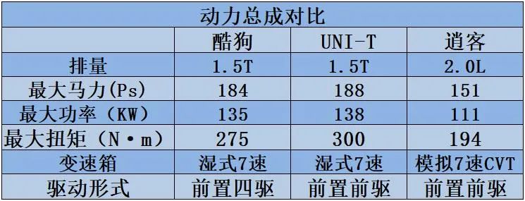 可以看到酷狗和UNI-T同为1.5T发动机+7速湿式双离合变速箱,几项参数也都差不太多,而逍客作为一款2.0L自然吸气发动机,在绝对动力上便和这些1.5T发动机相比落了下风,但是如果论绝对家用属性,逍客还是要胜过另外两台车一头的。
